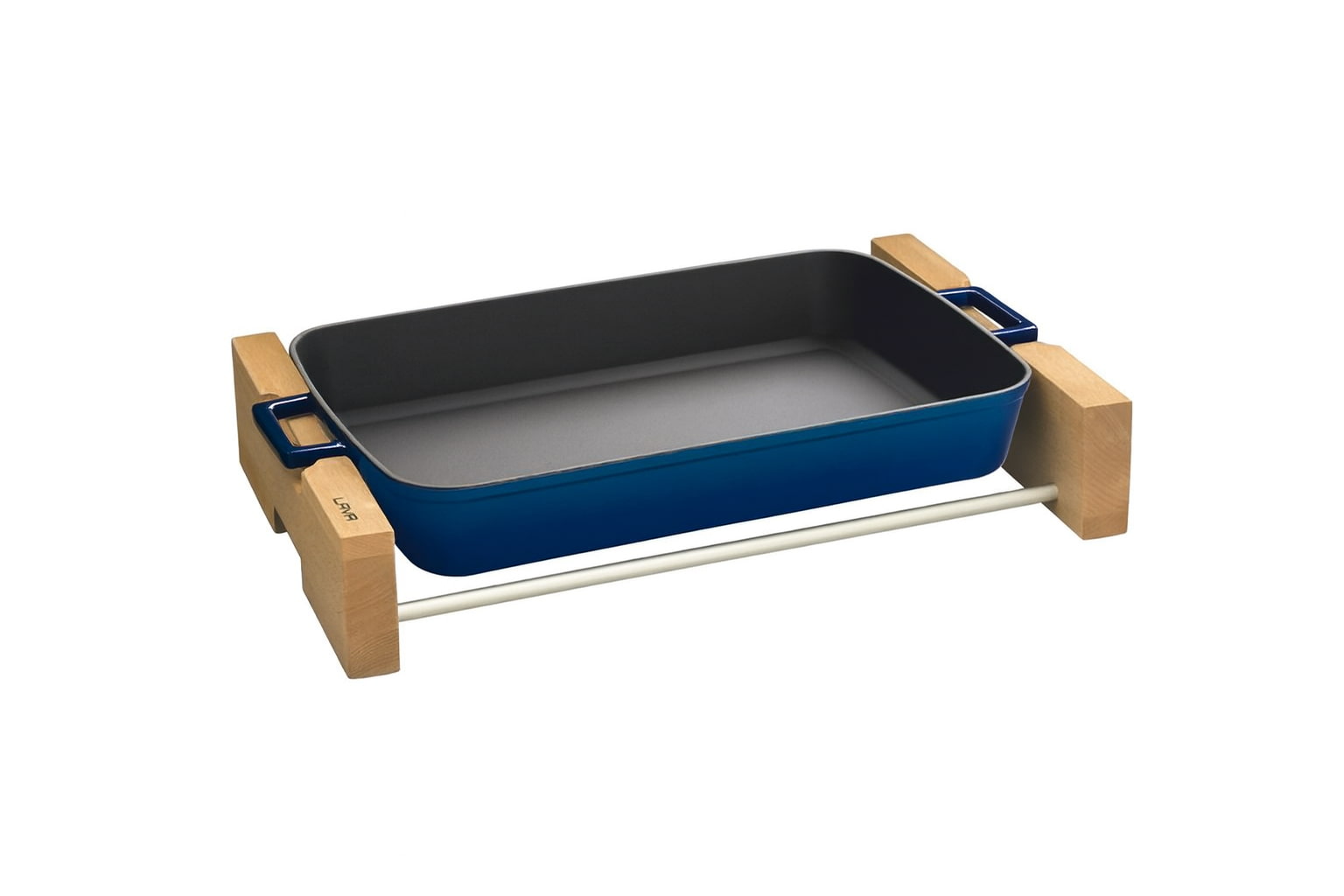 LAVA METAL Litinový pekáč 22x30cm s dřevěným podstavcem – modrý